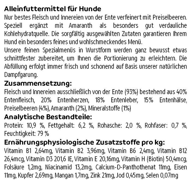 Füttern Sie täglich pro 5 kg Körpergewicht ca. 200 g. Diese Empfehlung ist ein Richtwert. Der individuelle Bedarf richtet sich nach Rasse, Aktivität, Alter und Haltungsbedingungen. Bitte zimmerwarm füttern und immer ausreichend frisches Trinkwasser bereitstellen.