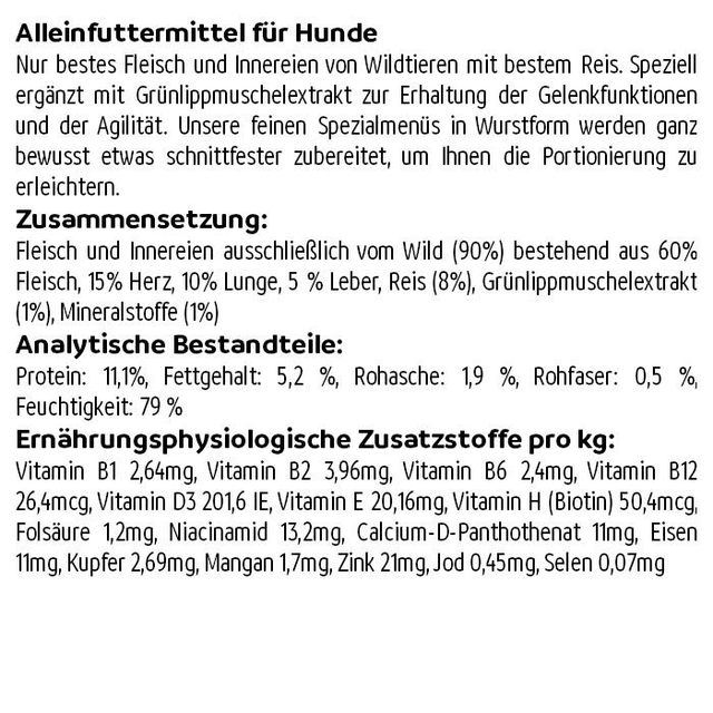 Füttern Sie täglich pro 5 kg Körpergewicht ca. 200 g. Diese Empfehlung ist ein Richtwert. Der individuelle Bedarf richtet sich nach Rasse, Aktivität, Alter und Haltungsbedingungen. Bitte zimmerwarm füttern und immer ausreichend frisches Trinkwasser bereitstellen.